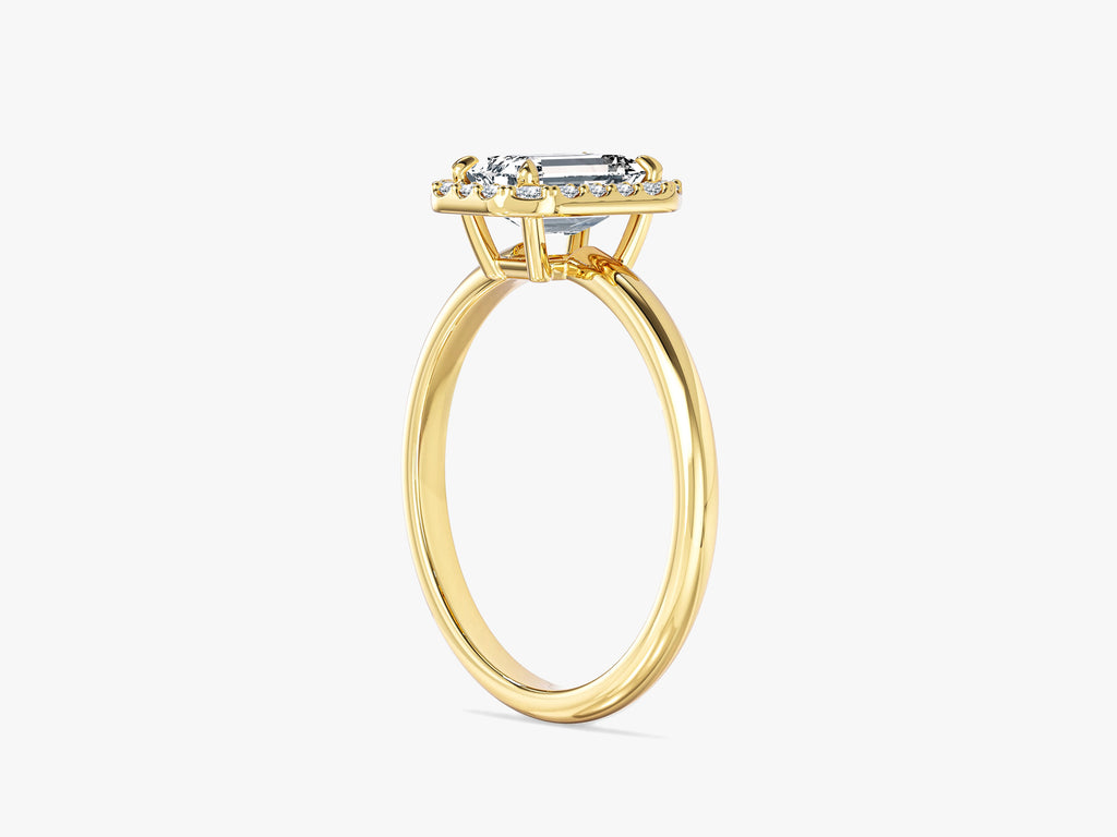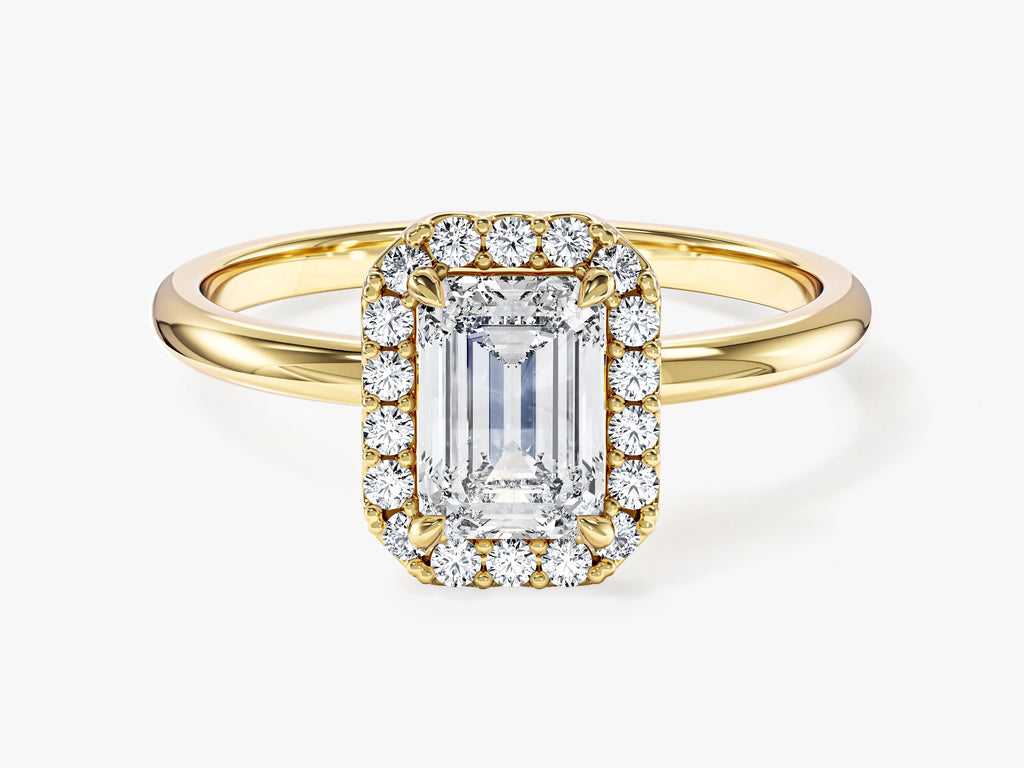 Step into the world of elegance with our Emerald Halo Lab Grown Diamond Engagement Ring, a harmonious blend of classic opulence and modern allure. This exquisite ring features a brilliant emerald-cut lab-grown diamond, crafted to enhance its exceptional clarity and captivating charm. Encircling the center stone, a delicate halo of ethically sourced lab-grown diamonds adds an extra layer of brilliance and sophistication to the design.
