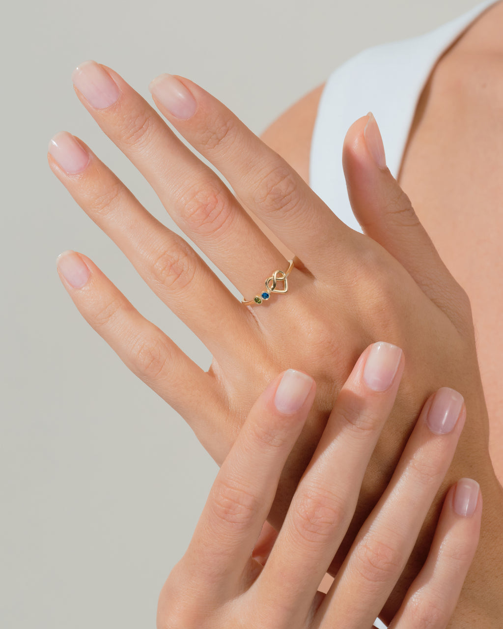This delicate ring is like a symbol of love and affection. Featuring a dainty infinity heart design, it's a lovely and cute piece that's sure to capture hearts. The small gemstones, customizable to your choice of birthstone, add a bit of color and personal meaning to the design. Whether you're celebrating a birthday, anniversary or simply want to express your love for someone you care about, this ring is a beautiful and thoughtful gift for sure.
