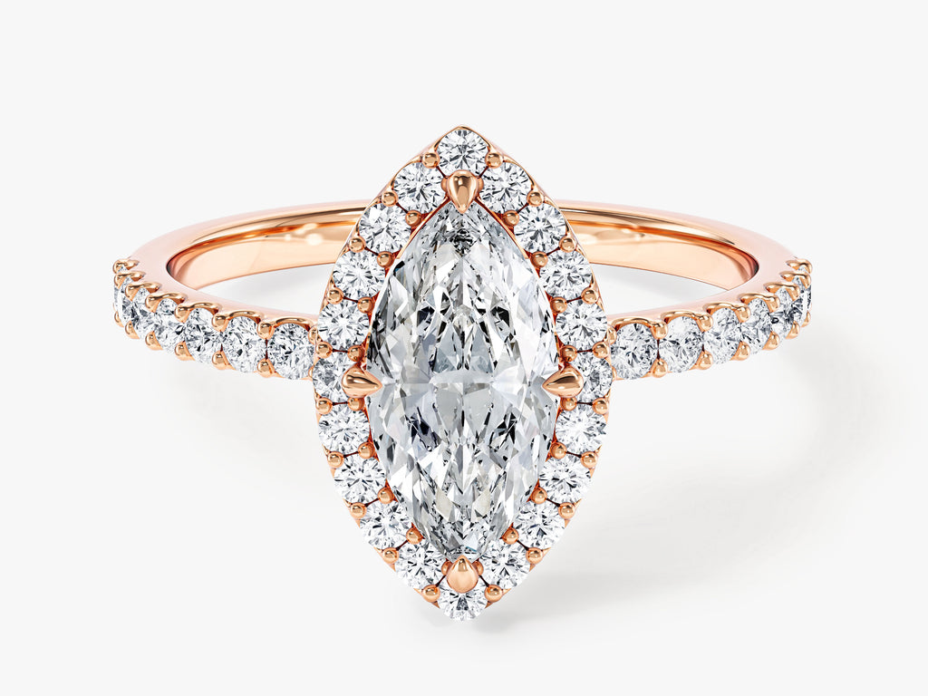 Prepare to be captivated by the Marquise Halo Lab Grown Diamond Engagement Ring with Pave Set Side Stones, a masterpiece that harmoniously combines classic charm with modern opulence. This extraordinary ring showcases a brilliant marquise-cut lab-grown diamond, meticulously crafted to emphasize its remarkable clarity and captivating beauty. The intricate halo setting adds an extra layer of shimmer and elegance to the ring.
