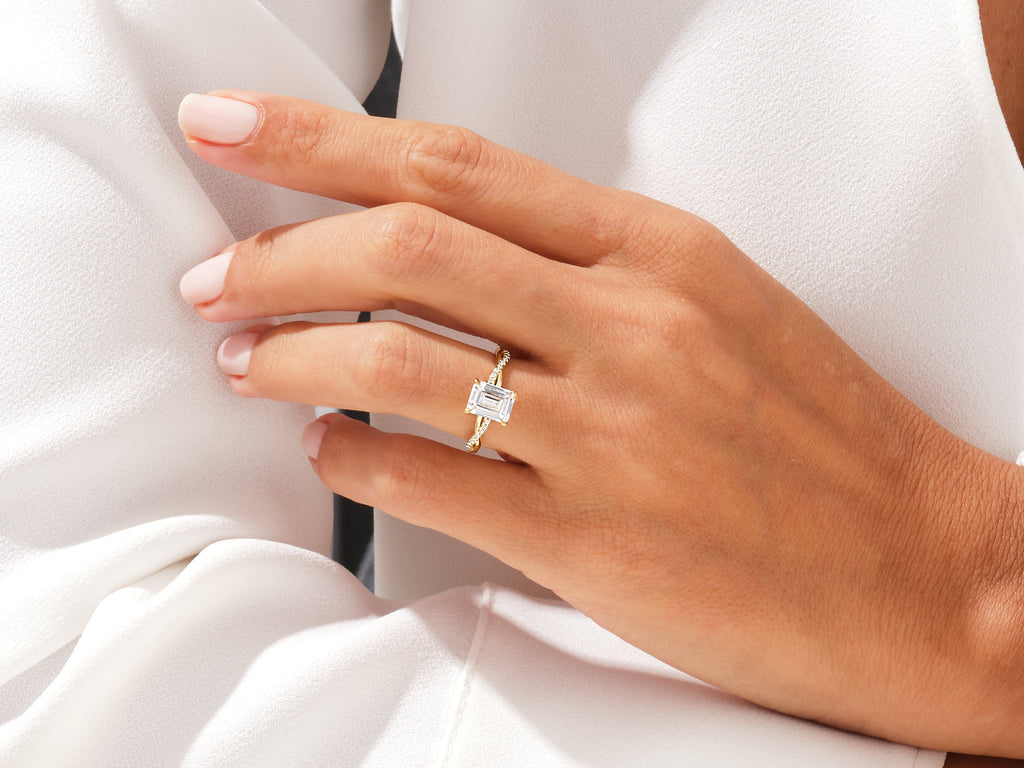 Twist Moissanit Verlobungsring im Smaragdschliff mit Seitensteinen (1.50 CT)